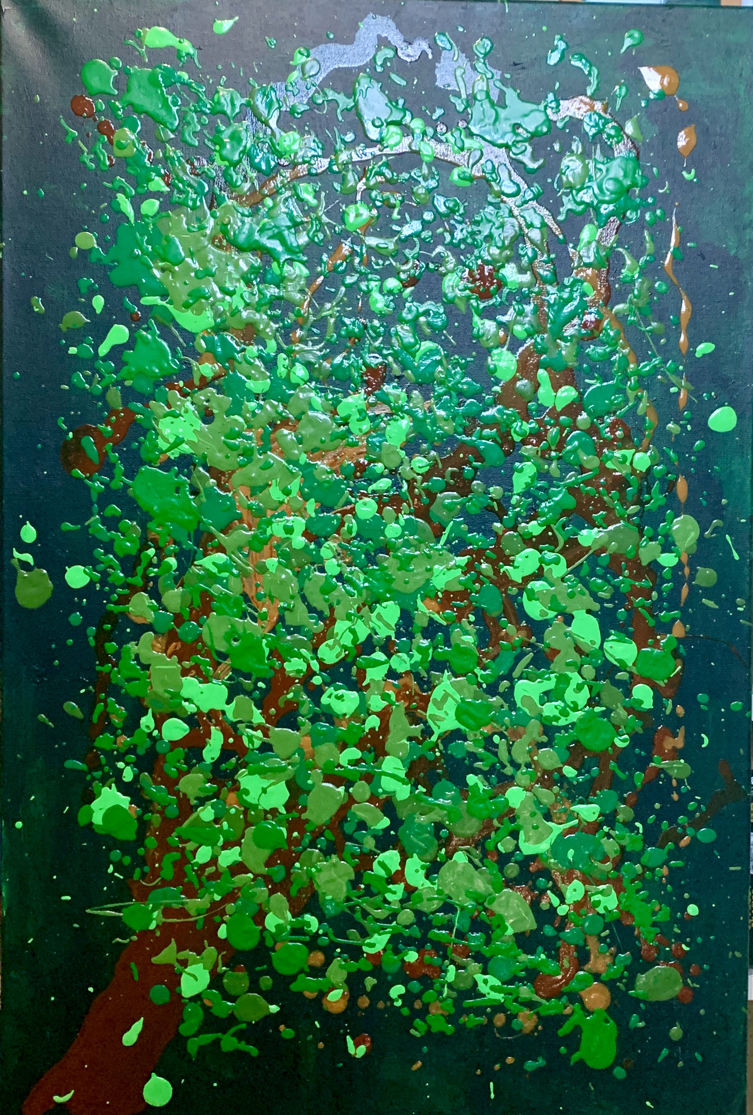 This is a fairly large painting, done over something I wasn’t crazy about and won’t miss. I took acrylic paint, thinned it with an additive and then dropped it on the canvas from about shoulder level, so there was some control, but not much. I wasn’t sure whether it should be ver