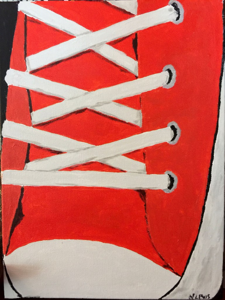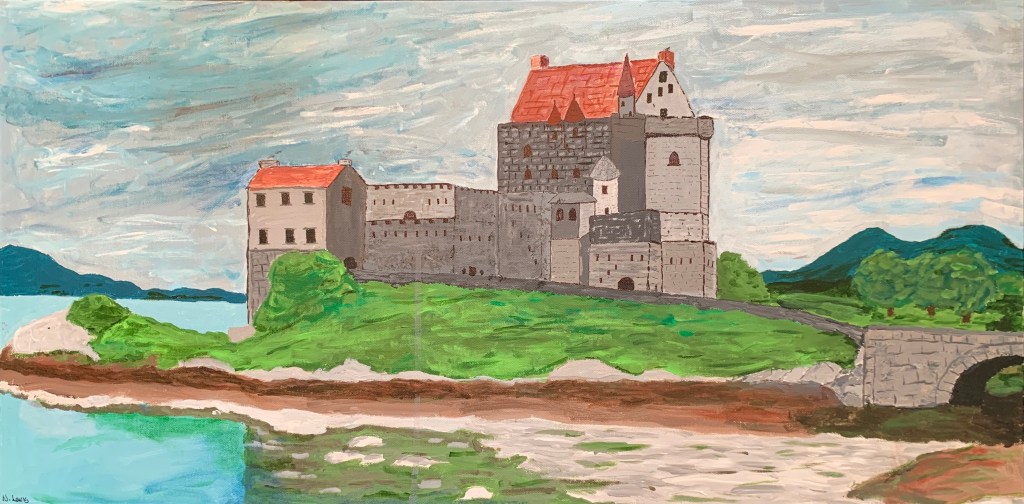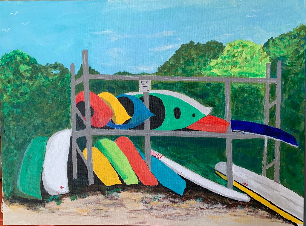 I did this over the course of about a week in January or February 2021. My sister-in-law, Linda, and I had been exchanging emails about Australian indigenous art (formerly called Aboriginal Art) and she sent me a video about creating dot paintings using Q-tips. So I tried it, given my love of this art form. It is pretty time consuming (and Q-tip consuming). I call this “The Snake Clan Meets by the River”.This a painting of a castle on a little island right near the bridge to the Isle of Skye in Scotland. If you have ever been to the Isle of Skye since they built the bridge, you certainly took a picture of this scene. On a whim, I bought a 15×30 canvas and this seemed to fit. This was torture to complete. I could never get the castle right, mainly because I didn’t have the skill or patience to do the tiny brushwork. I was close to giving up when I realized that I could get the necessary effect using Sharpies.This is one I started shortly after a trip to Martha’s Vineyard in July 2020. It is based on a nice photo of these really scenic kayaks and canoes on the walk down to the beach from where we were staying. It was bit of a grind, because the canoes where hard to get, so I kept quitting and them coming back to it. I finally deemed it complete around January 2021.