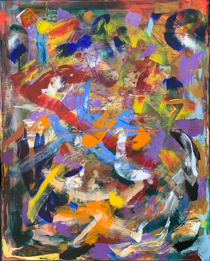 This was a long-term project I conceived to use up my acrylic paint on the palette. I would smear the paint on to this 24×36 canvas, creating layers. I would then occasionally sand the whole thing down with an orbital sander, exposing some of the lower layers. This continued for at least six months until January 2021, when I decided that the whole thing worked.